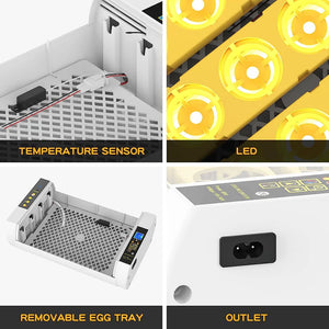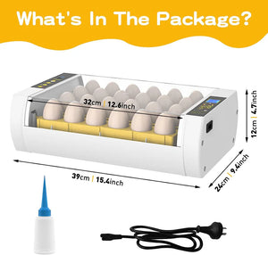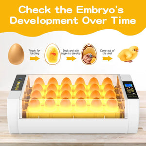 The egg incubator holds 24 eggs and design for beginners or professional breeders who want to incubate eggs on a smaller scale.