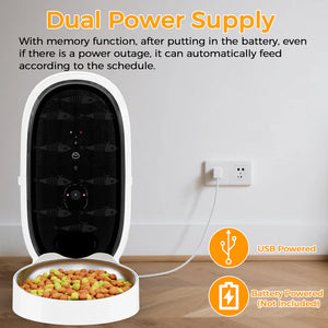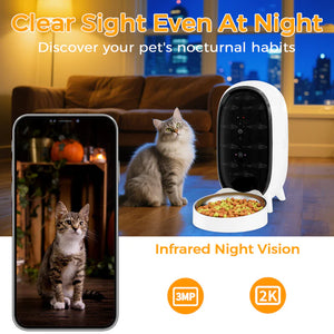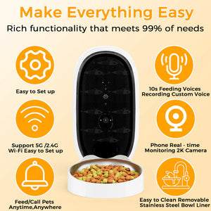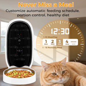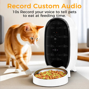 - Two-way Audio & Custom Meal Recording: Automatic pet feeder with advanced built-in microphones and speakers to keep you connected to your pets anytime, anywhere. The automatic cat feeder with camera allows you to record a recording of the feed (up to 10 seconds) and let your pet hear the familiar feed sound. Every feed will play a recording,creating a familiar mealtime experience for your pet.