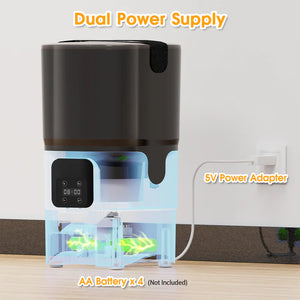 At the same time, Both the feeder and water dispenser can be powered by the dual power supply, so you don’t have to worry about your pet going hungry.