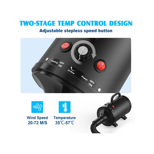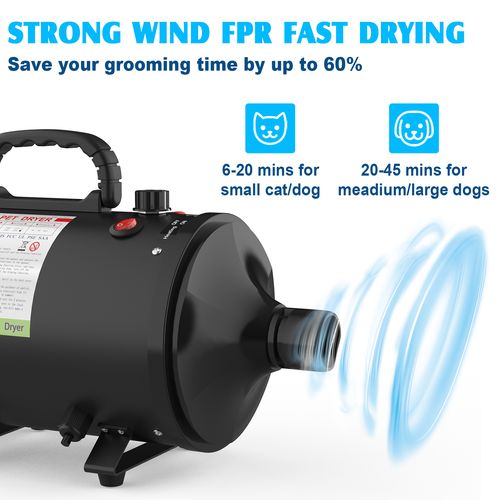 - 2000W Powerful Motor for Stepless Adjustable Blow Force: Our pet grooming hairdryer is the top groomers’ choice! 2000W powerful motor provides strong blow force and cuts down drying times. You can do a full salon-grade blowout in under 20 minutes! Adjustable wind speeds of 20-72 m/s can suit all kinds of pets and all your needs.