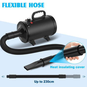 - Adjustable Anti-Heat Thickened Pipe: Protect Your Hands and BackLength adjustable pipe can extend to a full 230cm and retract to no less than 76cm. You can quickly find the most suitable position and save your spine and joints. Thickened plastic pipe protects your hands from scald. Comes with 4 different nozzles so that your pets can enjoy a full drying.