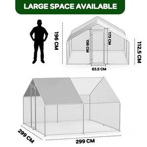 - Extra Spacious Spire Roof Design: This large metal chicken coop features a unique spire top that provides ample spave and a comfortable environment for your poultry. With dimensions of 3×3×1.95m(L x W x H), the walk-in chicken run offers plenty of space for your chickens, ducks, geese, and rabbits to roam freely.
