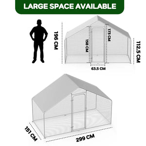 - Extra Spacious Spire Roof Design: This large metal chicken coop features a unique spire top that provides ample spave and a comfortable environment for your poultry. With dimensions of 3×1.5×1.95m(L x W x H), the walk-in chicken run offers plenty of space for your chickens, ducks, geese, and rabbits to roam freely.