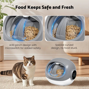 - Innovative Design for Freshness: The fully enclosed design keeps food fresh by closing the door when not in use, protecting it from dust and others. The unique curved shape of our smart cat feeder prevents food from getting stuck, while the anti-pinch feature adds an extra layer of safety for your pet. Additionally, the removable cat bowl boasts a 700ml capacity and is crafted from food-grade materials, ensuring the highest standards of health and safety for your cat.