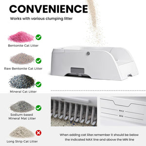 - Easy to Disassemble and Wash: Smart cat litter box is very easy to operate, disassembles in seconds for easy cleaning of the litter box, litter tray and removable rake.