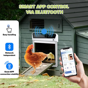 - APP Remote Control: The programmable automatic chicken coop door is controlled by APP via Bluetooth connection, allowing you to open or close it on site or at any desired time and place as needed. You can travel with peace of mind and operate the automatic chicken coop electric door anytime, anywhere.