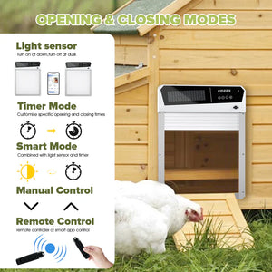 - 6 Modes Auto Chicken Door Opener: The automatic chicken door features six easy-to-operate modes: auto light sensor mode, timer mode, intelligent mode, App control mode, remote control mode, and manual mode. Both the timer and light sensor sensitivity are adjustable, providing seamless automation to meet your specific needs for when the chicken door opens or closes.