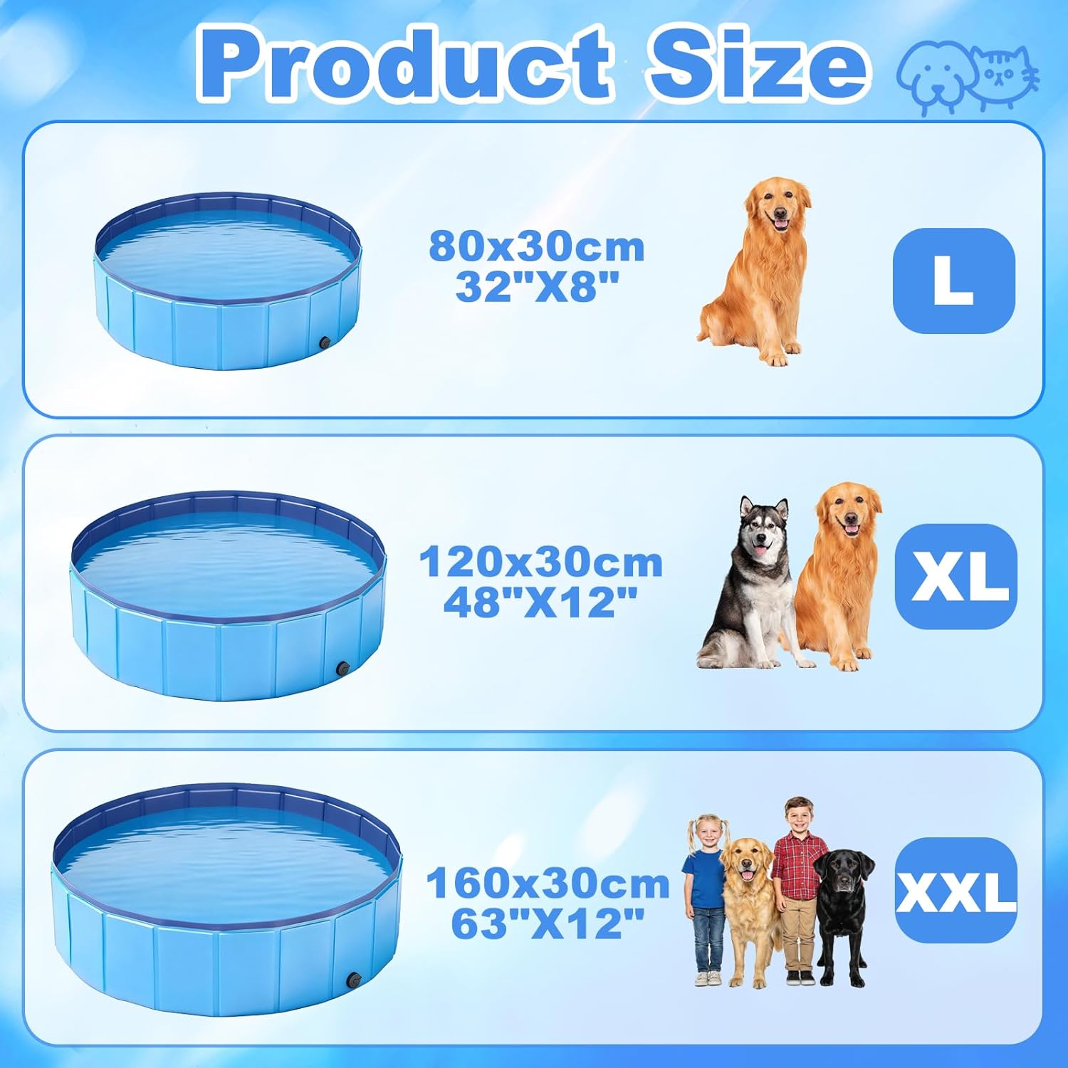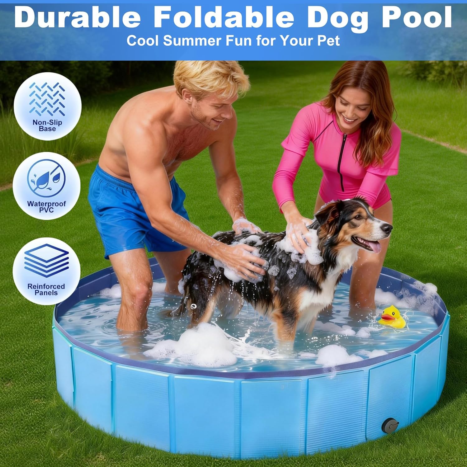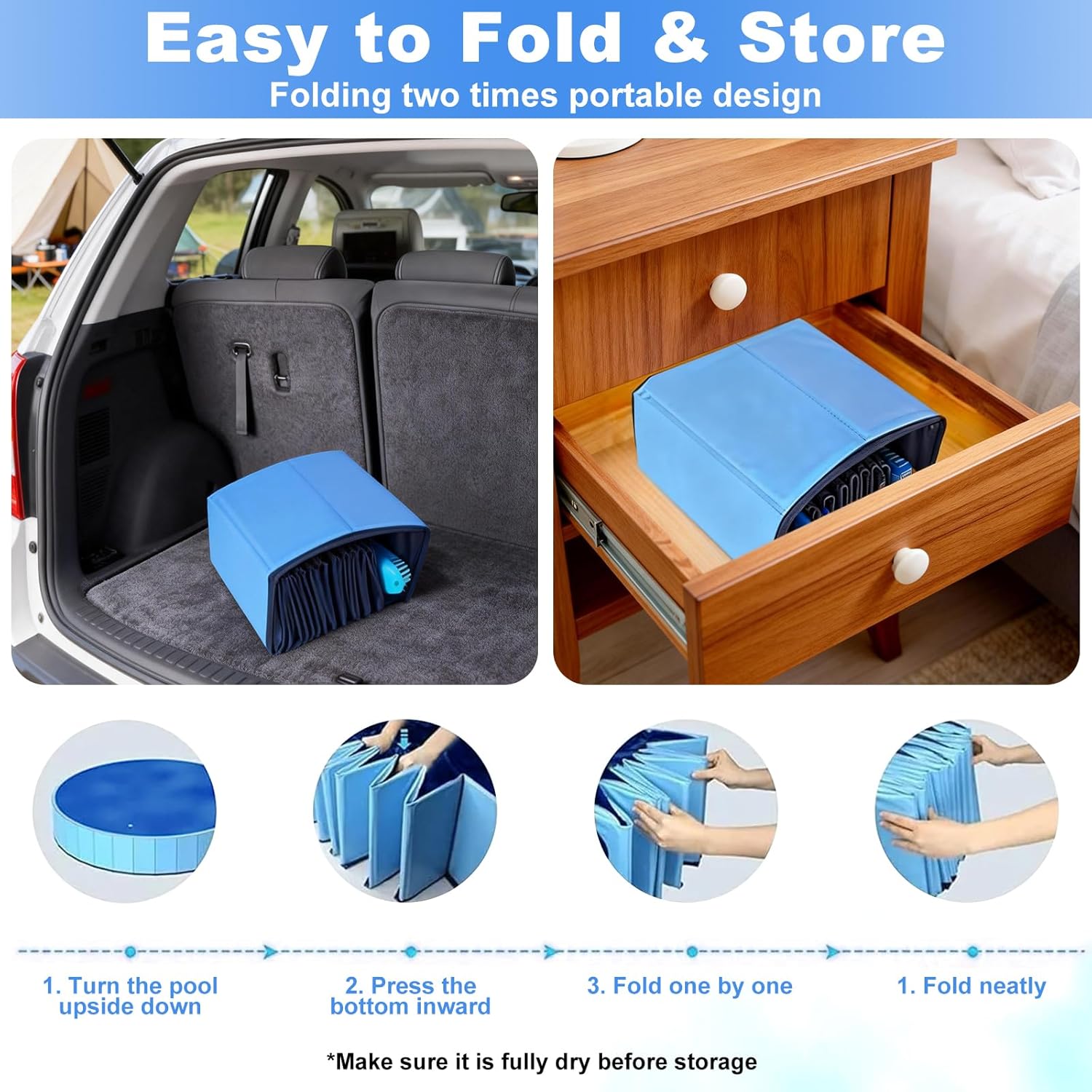 - 【🐇 Foldable & Portable】This portable dog pool features foldable design that easily folds down to a small size, dimensions when folded: 32× 11.5×31.5 cm, making it exceptionally convenient to carry and store. Whether you're camping, traveling with your dog for a water play session, or simply giving your furry friend a bath at home, it's always ready to use. When folded, it takes up minimal space—whether tucked into the trunk, tucked away in a closet corner, or stored on a shelf in the storage room, it keeps your storage area neat and tidy.