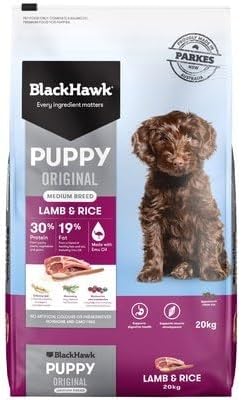 Black Hawk Original Lamb & Rice is a complete and balanced premium food for medium-breed puppies with an expected adult weight of 15-30 kg. It is made using Australian grass-fed lamb to provide highly digestible protein (rich in iron and vitamin B12) which helps strengthen muscles, improve bone health and boost vitality. This lamb & rice dog kibble contains a blend of Australian-sourced rice and oats, which helps provide energy to the body and brain. This high-quality diet also contains chicory root, a natural prebiotic superfood that supports intestinal health and aids in reducing food sensitivities.