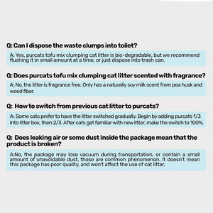 A: Some cats prefer to have the litter switched gradually. Begin by adding purcats 1/3into litter box, then 2/3. After cats get familiar with new litter, make the switch to 100%