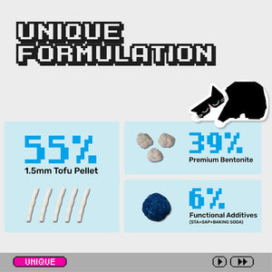 - Made of 55% tofu pellets, 39% premium bentonite, and 6% functional additives.