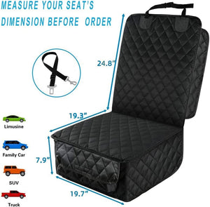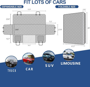 The hard bottom car seat cover for dogs measures 52" W x 63"L, fits for most cars, SUVs, and trucks.