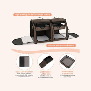 Designed with 2 large compartments, our soft-sided pet carrier can hold multiple cats. What's more, you can use it as a pet cage & a hidden pet toilet at the same time. Our ultra large pet carrier contains two cushions with warm velvet on one side and cool PP on the other, ensuring that your pet is pampered in different seasons. Moreover, 2 removable hammocks will provide extra space for pets to sleep or play. Besides, sunshade curtain is designed to provide privacy and block sunlight. Since there are vented mesh, once you roll up the practical curtain, your pets can enjoy scenery and fresh air. If you want to go for picnic with pets, there are multiple pockets to hold essential items. And an additional litter box is included to serve as a food or water bowl. Made of premium cationic dyed fabric, the double pet carrier is tough and sturdy enough. Additionally, interior anti-scratch fabric is suitable for them to grind paws. Thanks to foldable design, you can easily fold it into the carry bag and take it outdoors. Hence, it is definitely a thoughtful gift for your pets!