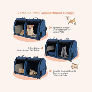 Designed with 2 large compartments, our soft-sided pet carrier can hold multiple cats. What's more, you can use it as a pet cage & a hidden pet toilet at the same time. Our ultra large pet carrier contains two cushions with warm velvet on one side and cool PP on the other, ensuring that your pet is pampered in different seasons. Moreover, 2 removable hammocks will provide extra space for pets to sleep or play. Besides, sunshade curtain is designed to provide privacy and block sunlight. Since there are vented mesh, once you roll up the practical curtain, your pets can enjoy scenery and fresh air. If you want to go for picnic with pets, there are multiple pockets to hold essential items. And an additional litter box is included to serve as a food or water bowl. Made of premium cationic dyed fabric, the double pet carrier is tough and sturdy enough. Additionally, interior anti-scratch fabric is suitable for them to grind paws. Thanks to foldable design, you can easily fold it into the carry bag and take it outdoors. Hence, it is definitely a thoughtful gift for your pets!
