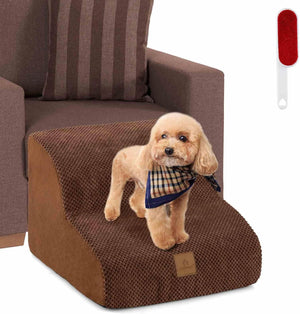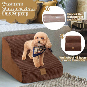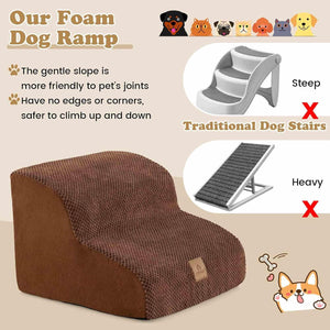 Our 2-tier foam dog ramp measures 41 x 43 x 29 cm (L x W x H) and loads up to 66 lbs, which is suitable for short-legged dogs or pets who suffer from arthritis, joint stiffness, or other mobility impairments, allowing them to climb up or go down the bed, sofa, or stool at will. It features a 30D high-density sponge core that provides soft yet sturdy support, a skin-friendly corduroy fabric surface to prevent your pets from slipping, and an anti-slip bottom to prevent the ramp from moving. With safety at the forefront, our stairs offer wider and deeper steps, creating a pet-friendly incline that is gentle on joints. Additionally, cleaning is a breeze with the removable zippered cover that is machine washable, and a pet hair remover brush is included for added maintenance ease. Notice: the stairs come in vacuum-compressed packaging for convenience, expanding fully 48 hours or more to its original shape.
