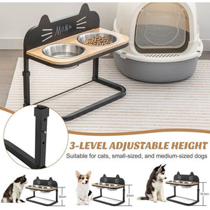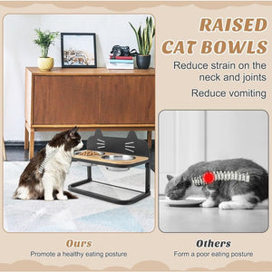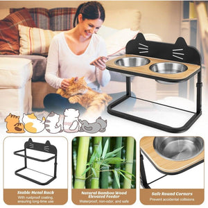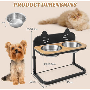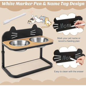 Perfect Feeding Way for Protecting Pet's Neck & Joints!Our raised pet feeding station measures 43 x 22 x 33-38.5 cm (L x W x H) and the height can be adjusted in 3 positions, which are suitable for cats, small-sized dogs, and medium-sized dogs. More than that, the elevated design can not only help pets to find a comfortable position to eat, but also effectively reduce strain on their back and neck. Besides, it comes with 2 stainless steel cat bowls, which are ideal for water, treats, dry food, and wet food. Also, they can be removed for easy refilling and cleaning. We provide a marker pen and a name tag, creating a unique food feeder for your lovely furry friend. And thanks to the natural bamboo board and rustproof metal rack, the elevated cat bowls are safe and sturdy enough, ensuring long-term use.