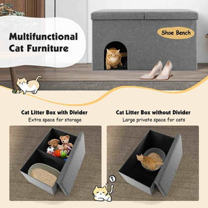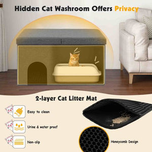 Our large cat litter box furniture features carbon filter to control odors, leaving your home smelling fresh. And the flip-up lid enables you to add cat litter without any hassle. With its 2-layer cat litter mat featuring a honeycomb design, the cat washroom prevents cat litters from scattering over your floors. Worried about urine penetrating the hidden litter box furniture? The waterproof inner keeps a clean and dry space for your pets. Plus, the washroom is made of wear-resistant oxford hemp for lasting use. The non-slip bottom ensures that the litter mat stays in place when your cats walk on it, reducing mess. But the cat litter box enclosure is not only a hidden cat washroom, but also a multifunctional cat furniture. Equipped with a removable divider, you can choose to assemble it for large private space or remove it to create extra storage space. Meanwhile, it is a comfortable shoe bench. Moreover, the hidden cat washroom furniture is easy to assemble.