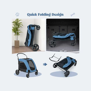 Our large dog stroller is the best choice to travel with your furry companions. With 82 x 65 x 63 cm large inner space, it is suitable for small to large sized dogs. Equipped with 2 entries and ventilate mesh, the large dog stroller ensures excellent ventilation & easy access. For a cleaning environment, there is a removable pad to collect litter. The adjustable padded anti-slip handle offers a comfortable grip and allows you to find the better posture. With 4 large wheels, you can effortlessly move the dog stroller. Besides, the rear wheels comes with brake to keep the stroller in place. And our stroller is equipped with a safety belt to secure your dogs during the ride. Constructed with oxford fabric, the pet stroller is not only wear-resistant but also waterproof for longevity. Additionally, the foldable pet stroller features a storage pocket for you to carry water bottles and poop bags. Moreover, the dog stroller is foldable for easy storage.