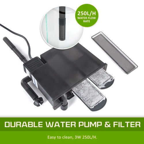 The 3W, 250L/H super-efficient filter with the pump is easy to clean and it has a water flow adjuster in order to adjust the water flow according to your needs. It comes with a spray bar in order to circulate the water more evenly and clean the water more efficiently.