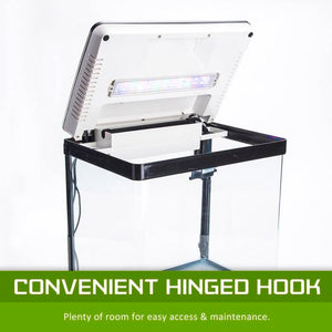 The tank is Curved Glass design for maximum display in any angle and it equipped with high-quality features that both you and your fish will love! The convenient hinged hood allows plenty of rooms for easy access and maintenance. The Low noise, high energy water pump with 8W 500L/hr flow, low energy 7W RGB LED lighting to provide UV for plants and a complete filtration system.