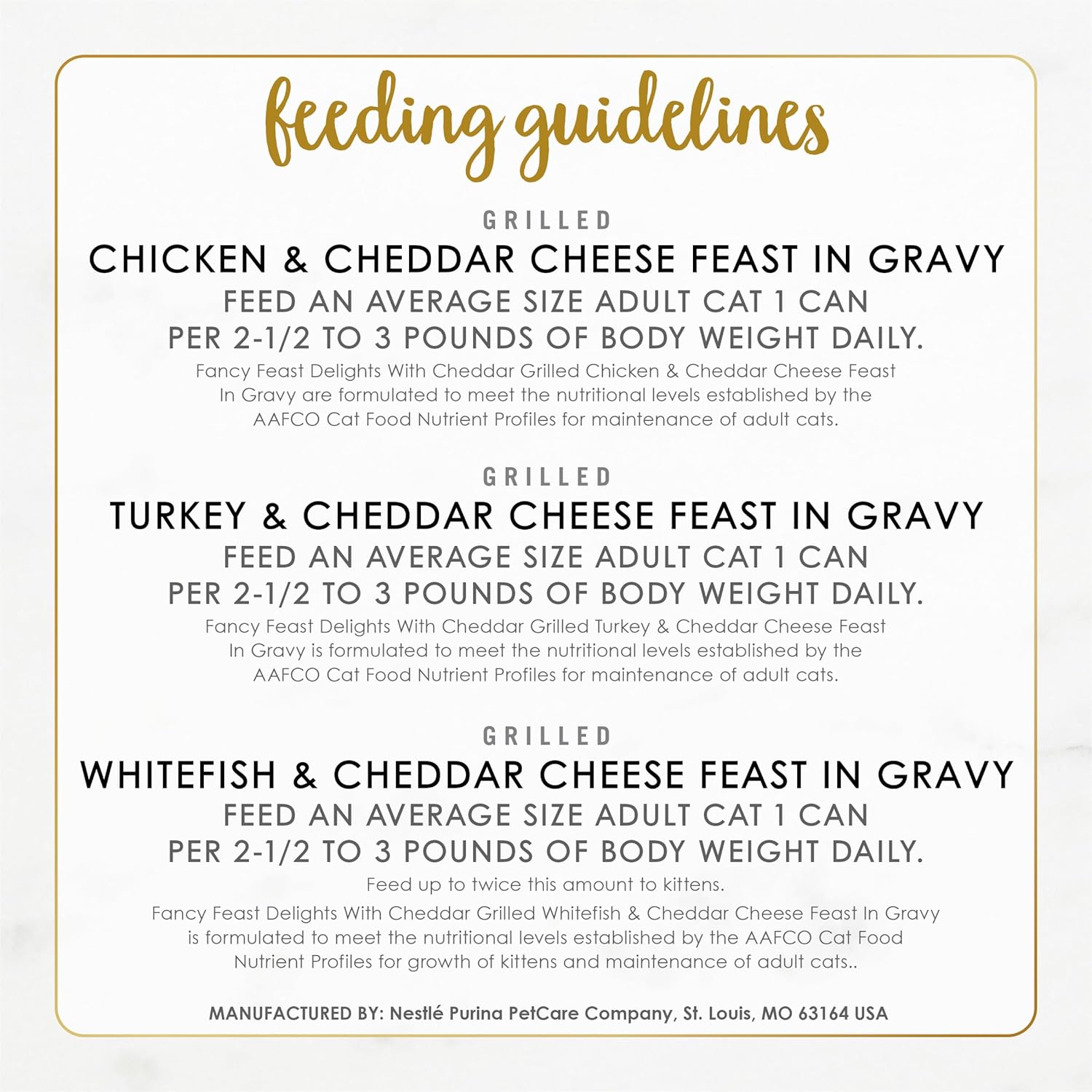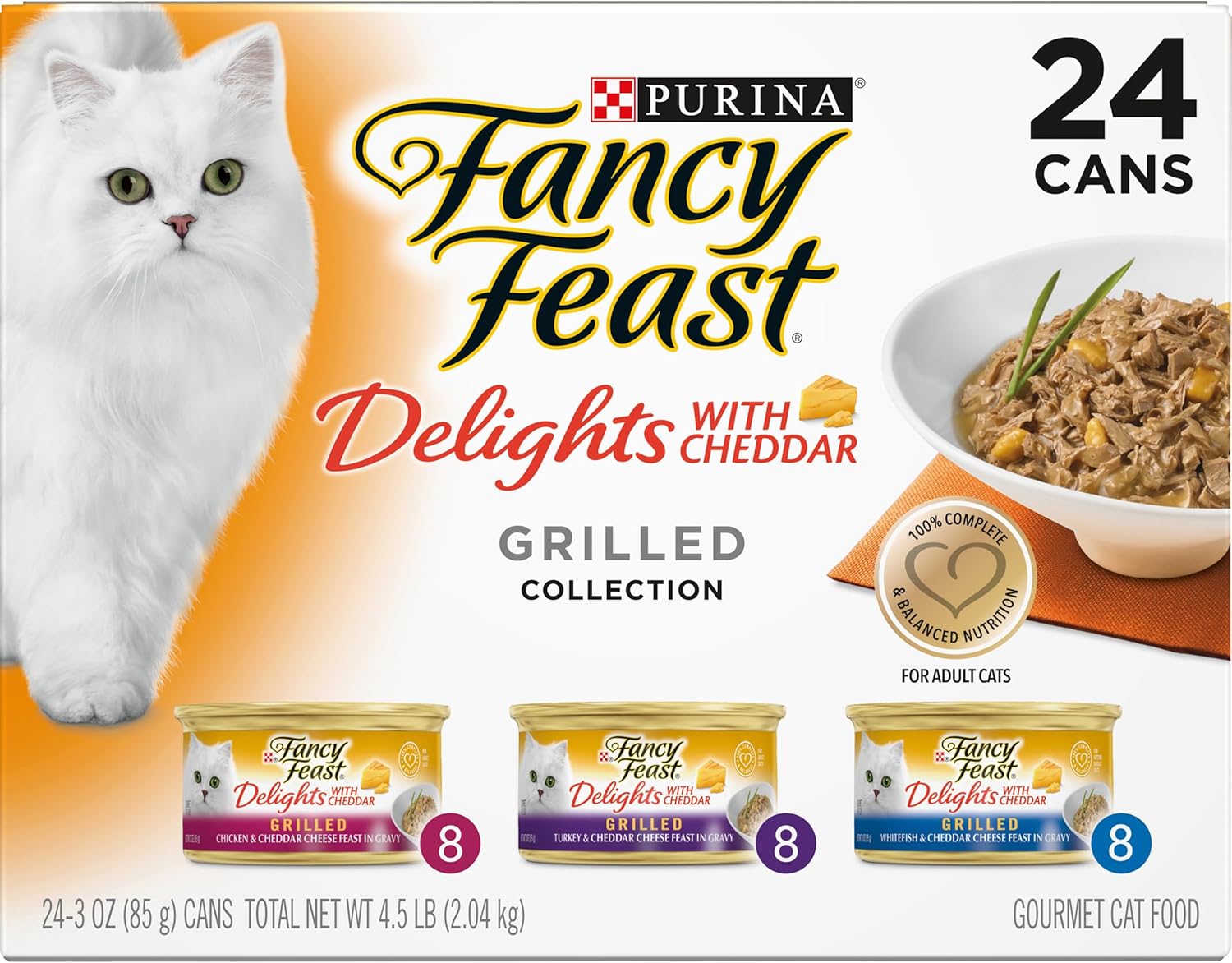 Fancy Feast Delights With Cheddar Grilled Chicken & Cheddar Cheese Feast in gravy Feeding directions: Feed an average size adult cat 1 can per 2-1/2 pounds of body weight daily. Fancy Feast Delights With Cheddar Grilled Turkey & Cheddar Cheese Feast in gravy Feeding directions: Feed an average size adult cat 1 can per 2-1/2 pounds of body weight daily. Fancy Feast Delights With Cheddar Grilled Whitefish & Cheddar Cheese Feast in gravy Feeding directions: Feed an average size adult cat 1 can per 2-1/2 pounds of body weight daily. Feed up to twice this amount to kittens.