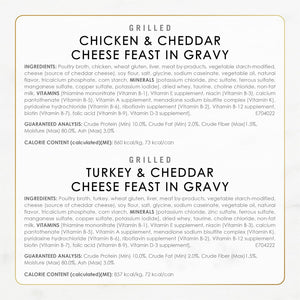 Fancy Feast Delights With Cheddar Grilled Chicken & Cheddar Cheese Feast in gravy Ingredients: Poultry broth, chicken, liver, wheat gluten, meat by-products, vegetable starch modified, cheese (source of cheddar cheese), artificial and natural flavors, salt, sodium caseinate, vegetable oil, tricalcium phosphate, soy protein concentrate, corn starch, added color. Minerals: [Potassium chloride, magnesium sulfate, zinc sulfate, ferrous sulfate, copper sulfate, manganese sulfate, potassium iodide], dried whey, taurine, choline chloride. Vitamins: [Thiamine mononitrate (Vitamin B-1), Vitamin E supplement, niacin (Vitamin B-3), calcium pantothenate (Vitamin B-5), Vitamin A supplement, menadione sodium bisulfite complex (Vitamin K), pyridoxine hydrochloride (Vitamin B-61, riboflavin supplement (Vitamin B-2), Vitamin B-12 supplement biotin (Vitamin B-7), folic acic (Vitamin B-91, Vitamin D-3 supplement], sorbic acid (a preservative). D-7040 Calorie Content INT, calculated) 844 kcal/kg 72 kcal/can. Fancy Feast Delights With Cheddar Grilled Turkey & Cheddar Cheese Feast in gravy Ingredients: Poultry broth, turkey, liver, wheat gluten, meat by-products, vegetable starch-modified, cheese (source of cheddar cheese), artificial and natural flavors, salt, sodium caseinate, vegetable oil, soy protein concentrate, tricalcium phosphate, corn starch, added color. Minerals: [Potassium chloride, magnesium sulfate, zinc sulfate, ferrous sulfate, copper sulfate, manganese sulfate, potassium iodide], dried whey, taurine, choline chloride. Vitamins: [Thiamine mononitrate (Vitamin B-11, Vitamin E supplement, niacin (Vitamin 13-31, calcium pantothenate (Vitamin B-51, Vitamin A supplement, menadione sodium bisulfite complex (Vitamin KI, pyridoxine hydrochloride (Vitamin B-61, riboflavin supplement (Vitamin B-2), Vitamin 13-12 supplement, biotin (Vitamin B-71, folic acid (Vitamin B-91, Vitamin D-3 supplement], sorbic acid (a preservative). D-7042 Calorie Content (ME, calculated) 851 kcal/kg 72 kcal/can. Fancy Feast Delights With Cheddar Grilled Whitefish & Cheddar Cheese Feast in gravy Ingredients: Ash broth, whitefish, liver, wheat gluten, meat by-products, vegetable starch-modified, cheese (source of cheddar cheese), chicken, natural and artificial flavors, salt, sodium caseinate, vegetable oil, tricalcium phosphate, soy protein concentrate, corn starch. Minerals: [Potassium chloride, magnesium sulfate, zinc sulfate, ferrous sulfate, copper sulfate, manganese sulfate, potassium iodide], dried whey, added color, taurine, choline chloride. Vitamins: [Thiamine mononitrate ,Vitamin B-1), Vitamin E supplement, niacin (Vitamin B-3), calcium pantothenate (Vitamin 8-5), Vitamin A supplement menadione sodium bisulfite complex (Vitamin K), pyridoxine hydrochloride (Vitamin B-61, riboflavin supplement (Vitamin B-2), Vitamin B-12 supplement, biotin (Vitamin B-7), folic acid (Vitamin B-9), Vitamin 0-3 supplement], sorbic acid (a preservative). D-7043 Calorie Content (VE, calculated) 831 kcal/kg 71 kcal/can. Every ingredient has a purpose.