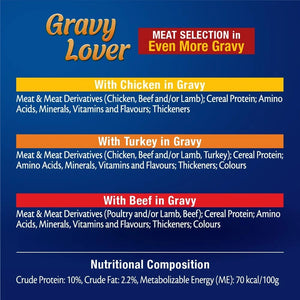 With CHICKEN in Gravy MEAT and MEAT Derivatives (CHICKEN, BEEF, And/Or Lamb); Cereal Protein; Amino Acids, Minerals, Vitamins and Flavours; Thickeners with Turkey in Gravy MEAT and MEAT Derivatives (CHICKEN, BEEF, And/Or Lamb, Turkey); Cereal Protein; Amino Acids, Minerals, Vitamins and Flavours; Thickeners; Colours with BEEF in Gravy MEAT and MEAT Derivatives (Poultry And/Or Lamb, BEEF); Cereal Protein; Amino Acids, Minerals, Vitamins and Flavours; Thickeners; Colours.