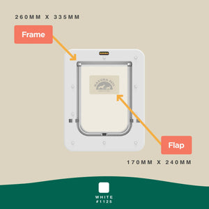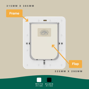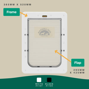 Replacement flap for the Hakuna Pets Super Tough Pet Door in Small (White #1125, Black #1183), Medium (White #1126, Black #1122) and Large (White #1127 & Black #1123). To replace, unscrew/remove the frame with the flap attached from the area it has been installed into. Sit one flap hinge in place and then wedge a screwdriver between the long edge of the flap and the inner edge of the frame to expand the frame enough for the other hinge to slot back in. Please note when leveraging the flap in and out of the hinge hole it does require some force but as the plastic flap is slightly flexible, it should be able to take the pressure.