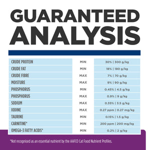 Crude Protein (min) 30%, Crude Fat (min) 18%, Crude Fibre (max) 7%, Moisture (max) 9%, Phosphorus (min) 0.45%, Phosphorus (max) 0.9%, Sodium (max) 0.35%, Iodine (max) 0.27 ppm, Taurine (min) 0.15%, Carnitine (min) 200 ppm, Omega-3 Fatty Acids (min) 0.2%