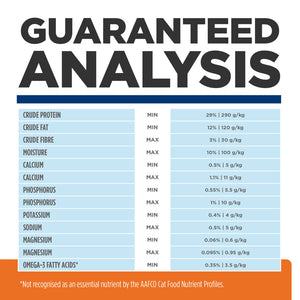 Chicken, Whole Grain Corn, Corn Gluten Meal, Whole Grain Wheat, Brewers Rice, Pork Fat, Chicken Meal, Egg Product, Pork Flavor, Soybean Oil, Fish Oil, Lactic Acid, L-Lysine, Calcium Sulfate, Potassium Chloride, Choline Chloride, Potassium Citrate, DL-Methionine, L-Tryptophan, vitamins (Vitamin E Supplement, Niacin Supplement, Thiamine Mononitrate, Calcium Pantothenate, Pyridoxine Hydrochloride, Vitamin A Supplement, Riboflavin Supplement, Biotin, Vitamin B12 Supplement, Folic Acid, Vitamin D3 Supplement), Taurine, Dried Hydrolyzed Casein, minerals (Ferrous Sulfate, Zinc Oxide, Copper Sulfate, Manganous Oxide, Calcium Iodate, Sodium Selenite), Iodized Salt, Mixed Tocopherols for freshness, Natural Flavors, Beta-Carotene.