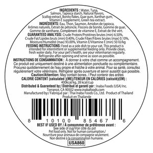 Water, Tuna, Salmon, Tapicoa,Starch, Natural Flavors, Scallop Extract,Bonito Flakes, Guar Gum, Xanthan Gum,Vitamin E Extract, Green Tea Extract