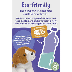 This Puppy is one of our cute cuddle buddies made from recycled plastic. All materials except from the eyes and nose are made from 100% certified post-consumer plastic. They are so incredibly soft you would never know they were made of plastic!