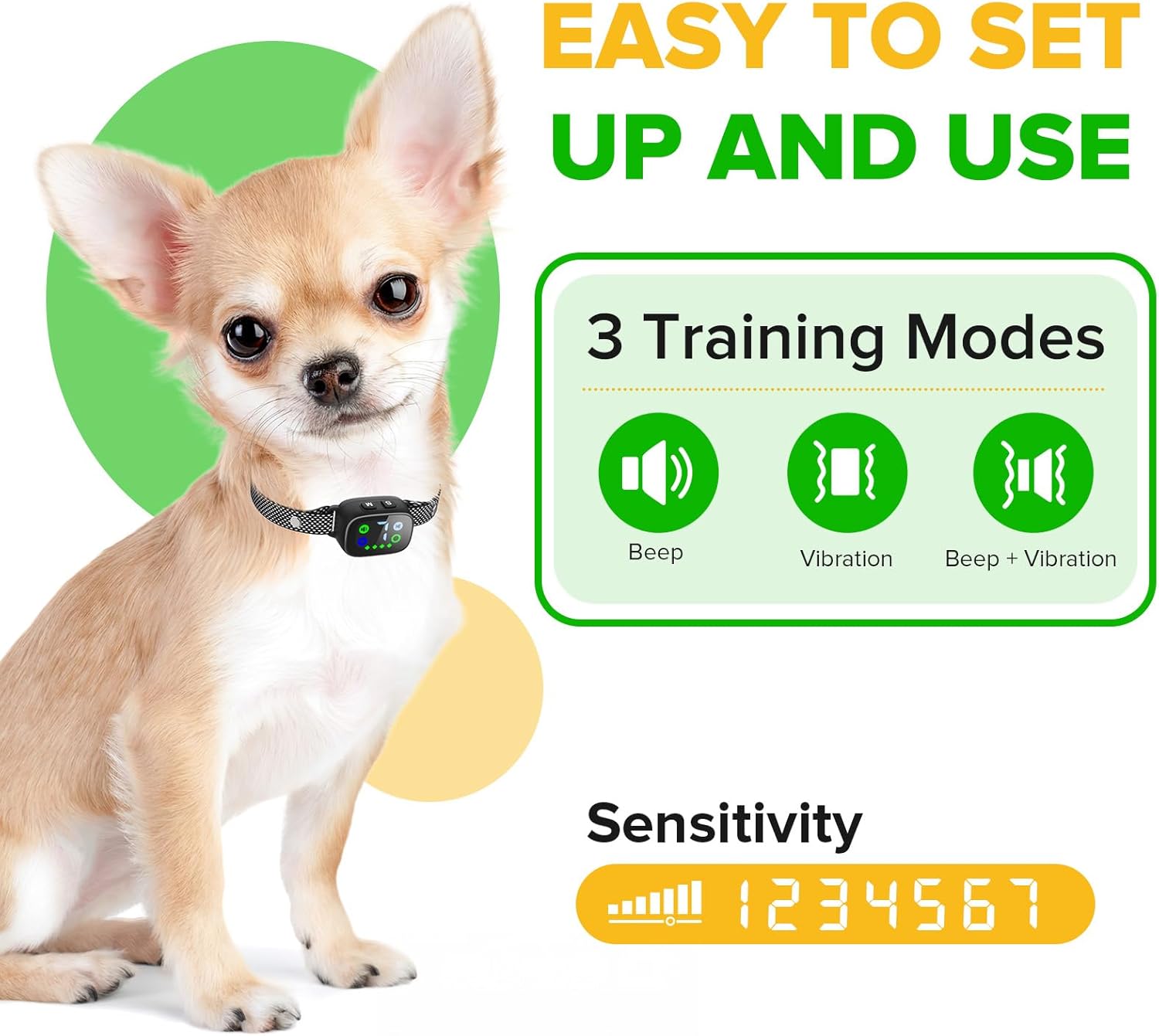 - Three Training Modes: The anti bark collar features three training modes: beep, vibration, and beep+vibration, with adjustable sensitivity levels from 1-7 for different environments. In order to prevent the dog from becoming immune to the warning sound, we also have a variety of different warning sound intensities, which gradually increase with the number of times the dog barks, allowing for effective training of dogs of all ages.
