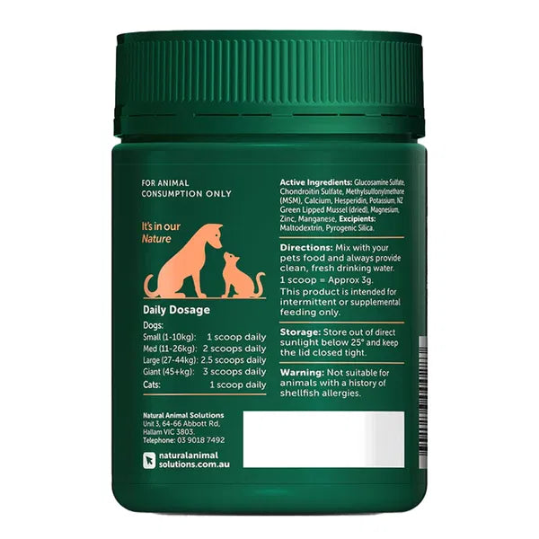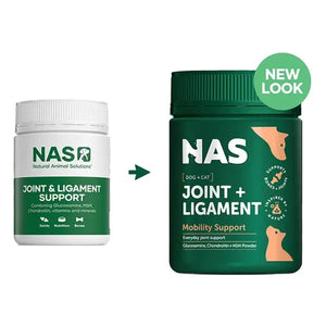 Natural Animal Solutions (NAS) Joint & Ligament Support Powder is a joint supplement formulated for dogs and cats of all breeds and ages. It features Chondroitin and Glucosamine to provide nutritional support for joint and cartilage repair.