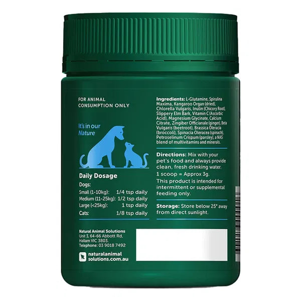| Active Ingredients | Glutamine, Inulin, Spinach leaf powder, Parsley leaf powder, Beetroot root powder, Broccoli, Green tea extract, Grapeseed extract, Ginger, Slippery elm, Stem, bark inner powder, Milk thistle, Acacia powder, Batecarotene, Thiamine hydrochloride (B1), Riboflavin (B2) ,Nicotinamide (B3) ,Calcium pantothenate (B5) ,Pyridoxine hydrochloride (B6), Cyancobaiamin (B12) ,Ascorbic acid (C) ,Cholecalciferol (D3) ,Vitamin E ,Biotin ,Folic acid ,Magnesium amino acid ,Magnesium citrate ,Calcium citrate ,Zinc sulphate, Vitamin A ,Selenium ,Copper ,Iron ,Potassium ,Phosphorus ,Omega 6 and amino acids (Taurine, Tryptophan, Threonine, Isoleucine, Leucine, Lysine, Methionine, Cystine). , natural Kangaroo liver, Chlorella (Chlorella pyrenoidosa) cell powder, Spirulina powder, Calcium hydrogen phosphate, Silica colloidal anhydrous, and Cellulose microcrystalline. |