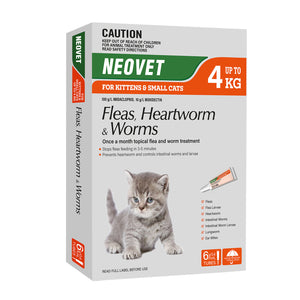 Neovet for Cats and Kittens is a topical multi-parasite protection for fleas, worms, and heartworm, and ear mites. It eliminates fleas, and flea larvae and reduces the incidence of flea allergy dermatitis. This monthly spot-on formula also treats and controls heartworm, roundworms, hookworms and lungworms, and ear mites. Specially formulated with the powerful ingredients imidacloprid plus moxidectin, this potent formula kills fleas and mites on contact (parasites don’t have to bite) and protects against immature, adult and larval stages of intestinal worms. It is an affordable, veterinary-grade treatment that is completely safe and effective for use in cats and kittens from 9 weeks of age.