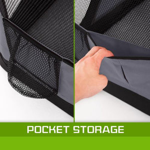 The soft crate is made of high-quality non-toxic 600D polyester and is highly water resistant. This makes it very strong and increases the service life. In order to keep your pet comfortable, there are mesh windows for better ventilation, anti-frying corners with 1200D fabric with high density material and a convenient to clean removable floor mat. There are side pockets as well so you can carry your pet's toys or other items it may need during the journey. The carry handles are of high-quality and there is also a carry strap if you need your hands free! The soft crate is also foldable so if you are short in storage room, you can conveniently.