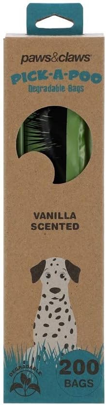- Clean up after your furry friends with the 200PK Paws & Claws Pick-A-Poo Degradable Waste Bags Dispenser - Vanilla Scented degradable waste bags, featuring an in-box dispenser for easy use.