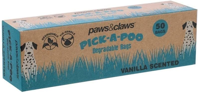 Paws and Claws Pick-A-Poo Degradable Vanilla Scented Waste Bags with Handle used to clean up after your furry friends. Design safely holds 120 degradable waste bags at a time and dispenses them easily to clean up when out and about. Our design is earth friendly, degradable and tough enough to hold mess without any leaks. Suits Paws and Claws degradable waste bags.