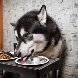 The dog feeder includes two stainless steel bowls for easy cleaning and maintenence. The legs of the stylish frame are outfitted with non-slip pads to prevent tipping and skidding, and the feeder's spill ridge keeps food and water off the floor.