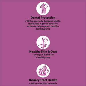 DENTAL PROTECTION With a specially designed kibble. It provides a gentle abrasive action to help support healthy teeth & gums